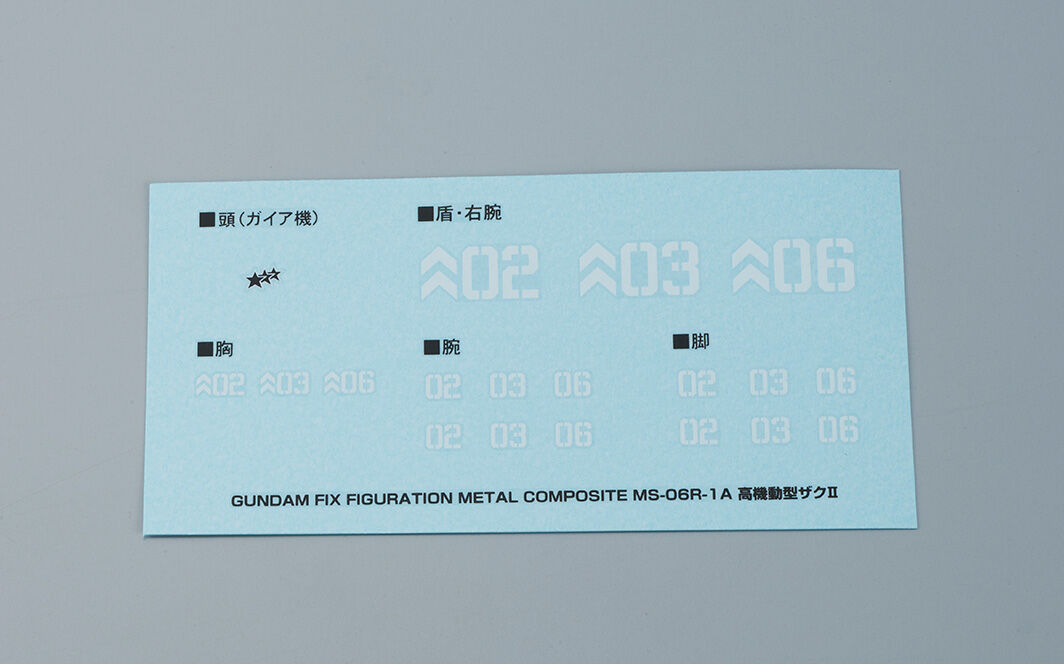 ガイア機、マッシュ機、オルテガ機のそれぞれの機体ナンバーは水転写式デカールとなっており、再現したい機体に合わせて貼ることができる