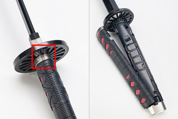 名セリフは、2種のモードで楽しめる仕様になっております。鍔の下のつめ掛けでカバーを外すと、電源スイッチがみえるので、それを左右に切り替える事で「鬼殺モード」と「頑張れ炭治郎モード」を起動することができます。
